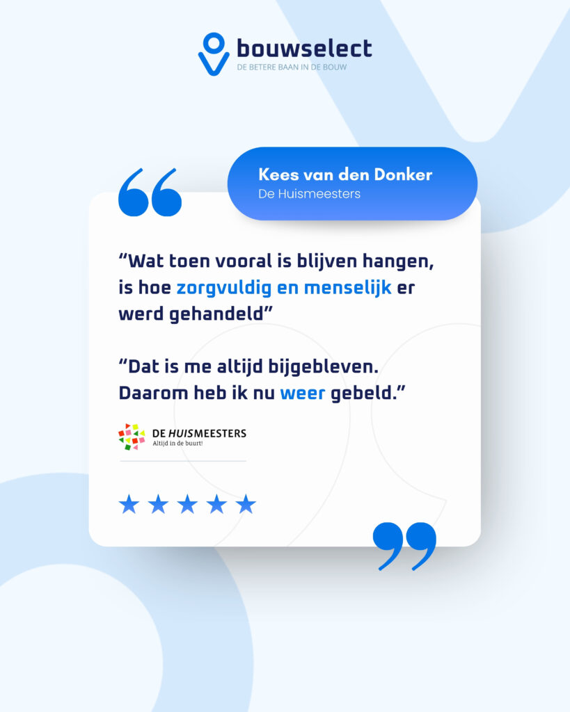 Niet alles is meetbaar, zegt hij. Geen overdreven beloftes, geen glad verhaal, maar een samenwerking die klopt. Aan mensen die twijfelen over werken via een uitzendbureau heeft hij een simpel advies: “Bel Bouwselect. Vertel je verhaal. Je moet het niet ingewikkelder maken dan het is. Ze denken met je mee en werken erg fijn.” Een mooi voorbeeld van hoe aandacht voor de mens, ruimte voor wensen en eerlijk contact leiden tot een samenwerking die past, precies waar Bouwselect voor staat